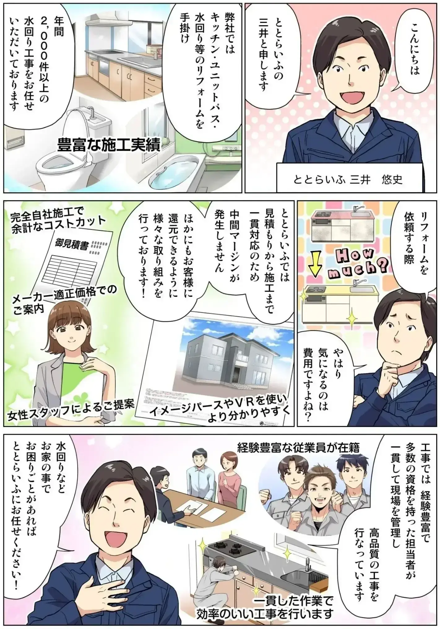 その傍らで「無駄な中間マージンを削減して、より低コストでお客様に提供できないか」という思いで水廻りリフォーム専門の『ととらいふ』を設立いたしました。下請けとして長年培った技術力、専門知識がありますので安心してお任せください。1 人でも多くのお客様に安心・満足いただけるよう日々努めてまいります。