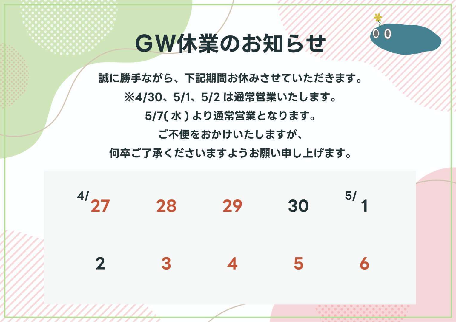 【 GW 休業のお知らせ 】
